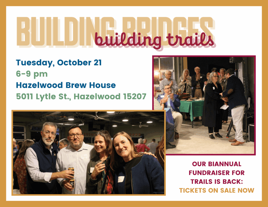 Join us for our second ever Building Bridges, Building Trails event – an event supporting and celebrating trails. This year’s event will take place at Hazelwood Brew House on Tuesday, October 21st from 6-9pm and will feature brews, autumnal appetizers, raffles, awards presented, and keynote speaker Allegheny Executive Sara Innamorato.